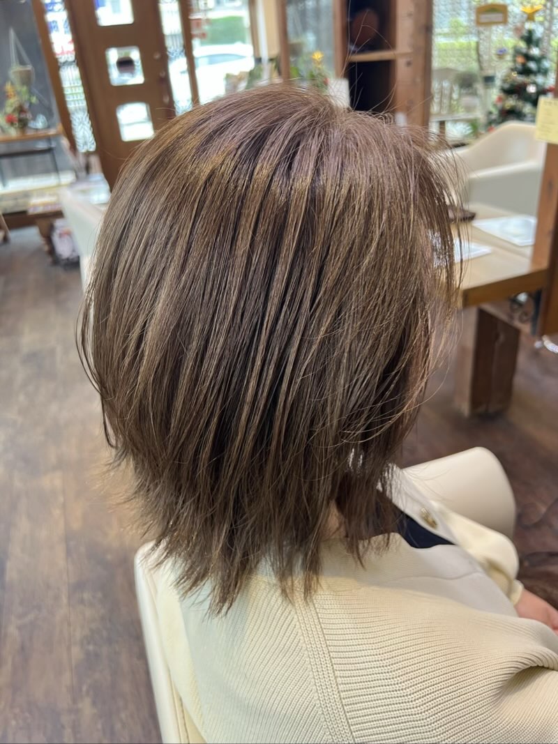 【美容師解説】ミルクティーベージュのミディアムレイヤーでつくる外ハネ透明感ヘア